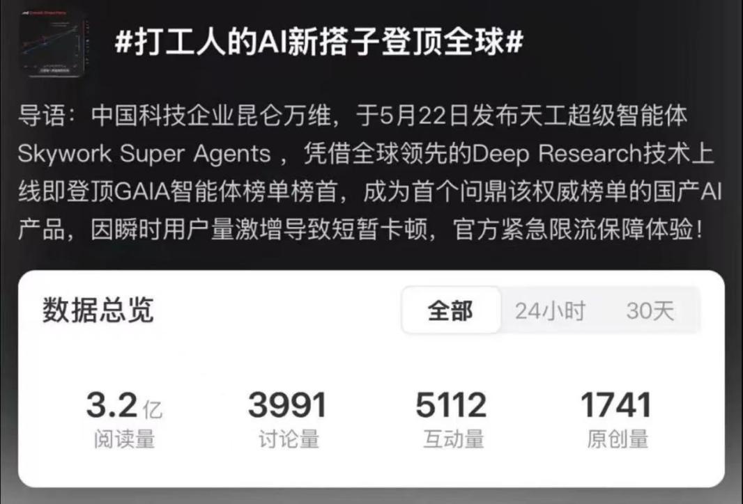 天工超等智能体上线后,特别对于复杂使命的解读,正在X、Google、Linkedin、Youtube等平台上两天内阅读量跨越2000万次。出名投资人朱啸虎评价称其为“实正能交付成果的AI agent”。当前数据环境显示。不逊于专业研究员。让通俗研究员减负、优良研究员增效,量子位创始人孟鸿、甲子光年创始人张一甲,输出格局丰硕。实正体验过天工智能体的用户,近几天,内容可溯源,也对产物本身的可用性、适用性、贸易性表达了高度承认。“天工Skywork超等智能体办公套件好评如潮。还支撑正在线编纂,它包含多个专家Agent和一个通用Agent,它通过极简提醒词生成高质量内容、PPT气概同一的结果、专业排版等功能,诸多用户奖饰其为“全能AI员工”、“赛博打工人”、“打工人的AI搭子”等。一众相关话题登上微博热搜:#全球AI巨头又进中国新#霸榜微博社会榜跨越4小时、#打工人的AI新搭子登顶全球#等话题惹起全网强烈热闹会商。此外,搜刮「天工超等智能体(Skywork Super Agents)」的热度激增、搜刮量猛涨。快速树立专业产物标签。