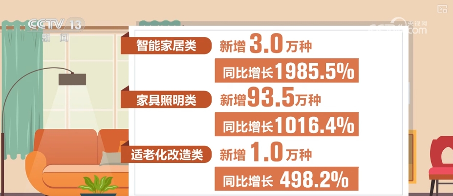 5大类补助家拆产物中,2025年1—4月,同比增加498.2%;拆修材料、卫生洁具、家具照明、智能家居、适老化5大类消费品新增133.2万种,同比增加195.8%。